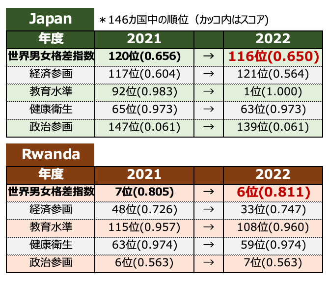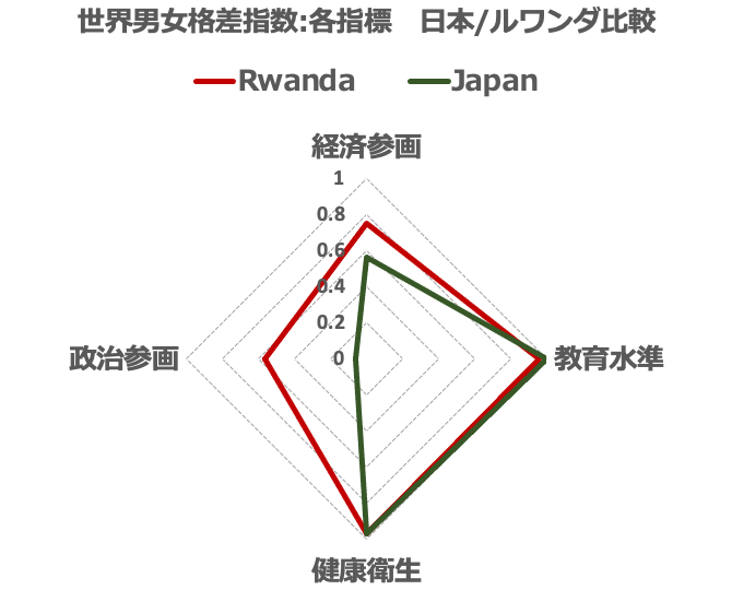 現在、日本は、ジェンダー指数では、116位で、世界の中でもかなり低い一方で、アフリカでは ルワンダは6位となっている。日本は、教育的な平等は、1位を達成しているものの、その他は、大きく後れをとっている。