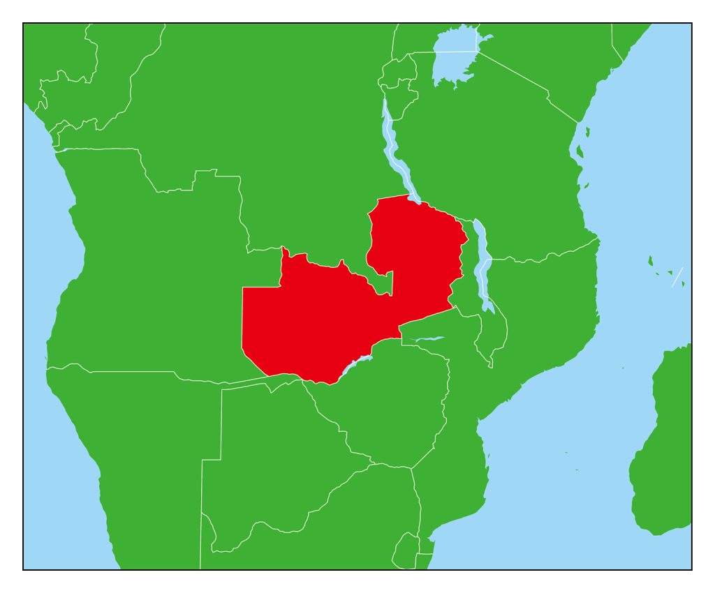 ザンビアは南部アフリカに位置しており、力こぶのような形をしています。コンゴ民主共和国、タンザニア、マラウイ、モザンビーク、ジンバブエ、ナミビア、アンゴラ、ボツワナの8か国と隣接している内陸国であり、南部アフリカの要衝の1つです。