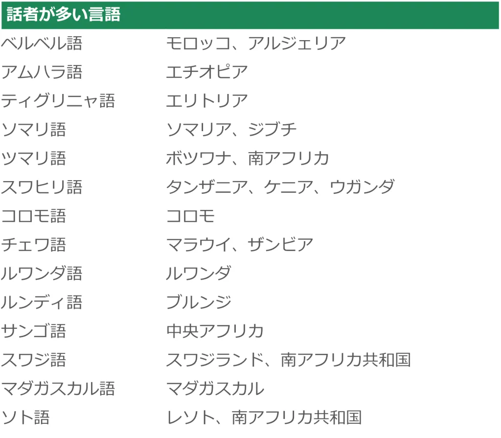 アフリカで話されている言語は2100種類以上あるといわれていますが、主な公用語で紹介した英語、フランス語、スペイン語、アラビア語、ポルトガル語の5つの言語以外に話者が多い言語についていくつか紹介します。