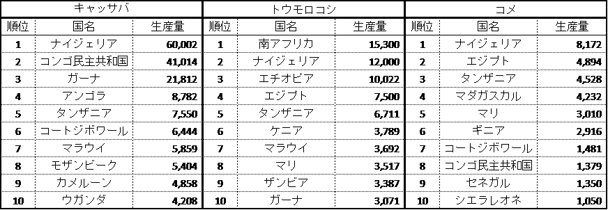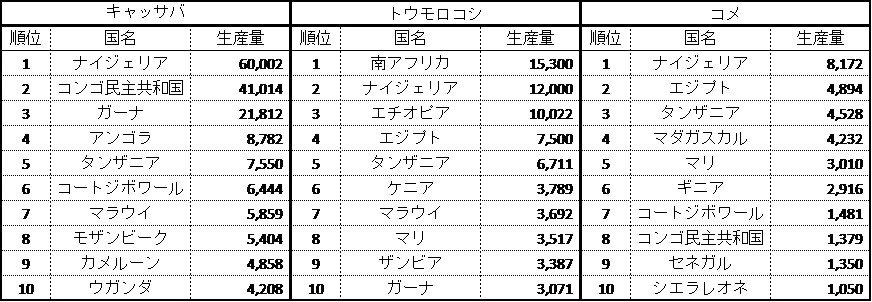 アフリカ屈指の生産量で広く食べられている「キャッサバ」、「トウモロコシ」、「コメ」の3品目の栽培に適した気候・場所について、国別生産量TOP10のランキングを基に見ていきましょう。図表1:アフリカの穀物・イモ類生産量国別TOP10(2020年版)